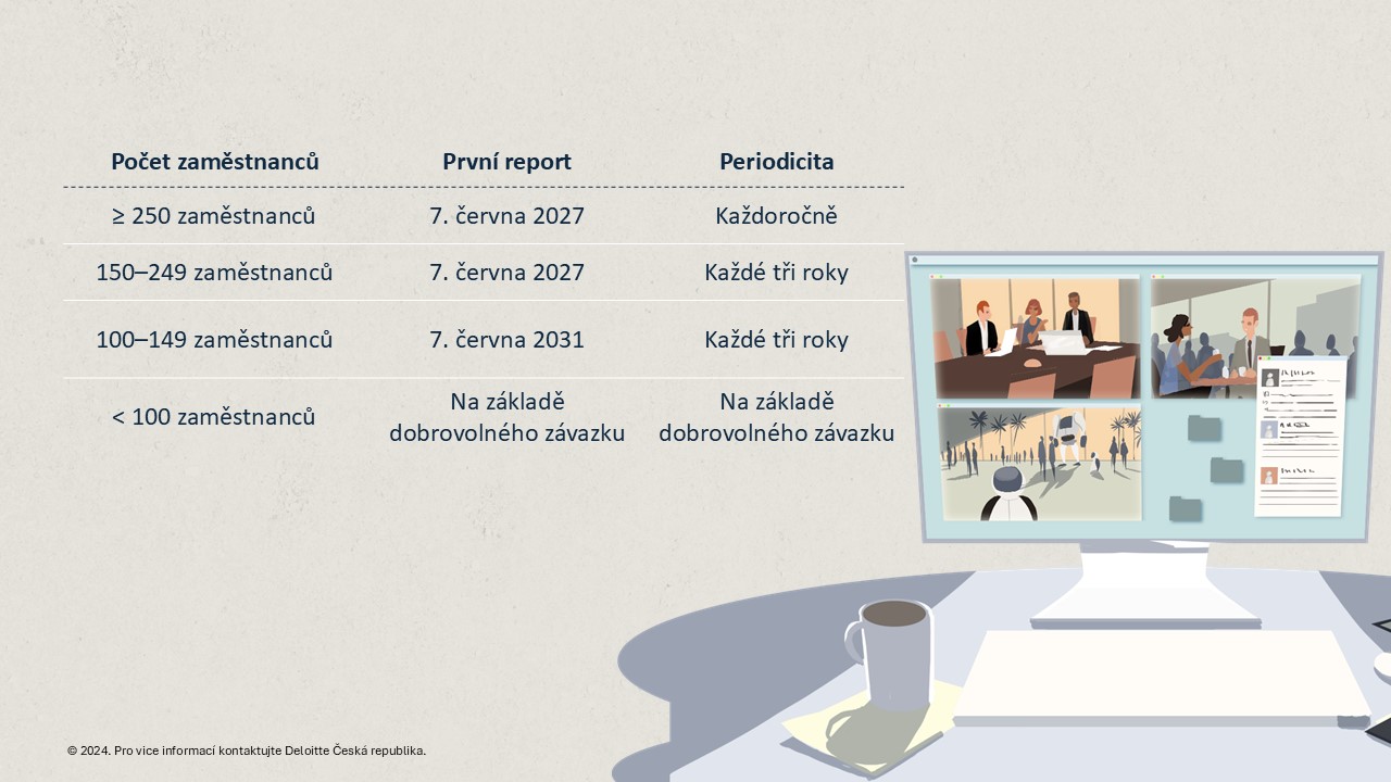 Nová pravidla se dotknou všech zaměstnavatelů nehledě na jejich velikost. Členské státy jsou povinny směrnici implementovat do června 2026. Reporting rozdílů v odměňování mužů a žen se bude dle směrnice týkat pouze společností, které mají 100 a více zaměstnanců (český zákonodárce nicméně může povinnosti stanovit i pro menší společnosti). Periodicita reportingu a termínu odevzdání prvního reportu se bude lišit v závislosti na velikosti společnosti. Firmy, které zaměstnávají více než 150 zaměstnanců, budou povinny údaje o rozdílu v odměňování mužů a žen předložit v roce 2027, avšak reportovat se budou data již za rok 2026.