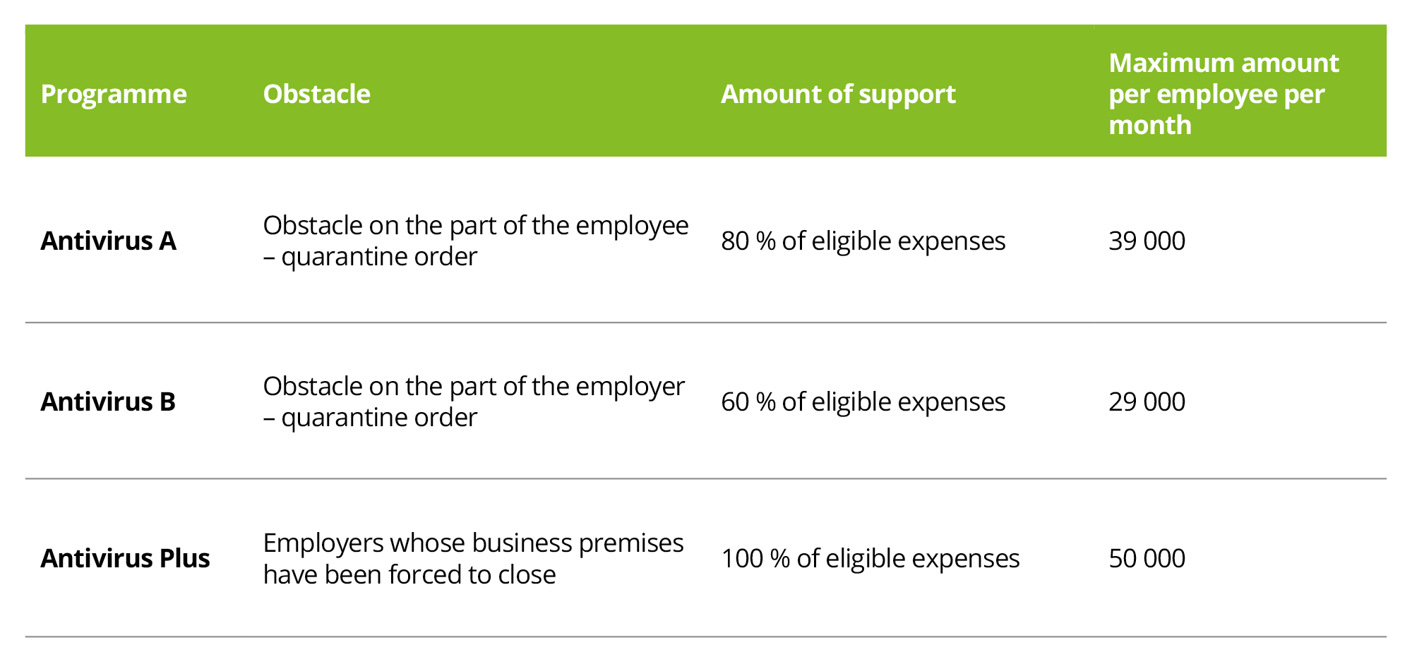 Businesses – regardless of their size – have mostly been using the Antivirus Programme, the main objective of which is to minimise the impacts of the crisis on the employment rate. It is a contribution for full or partial salary compensations attributable to employees due to an obstacle on the part of the employee (quarantine order) or on the part of the employer (obstacle – closing of business premises due to the government order to close the business) if there is a proof that the obstacle to work was a result of COVID-19 infection.
