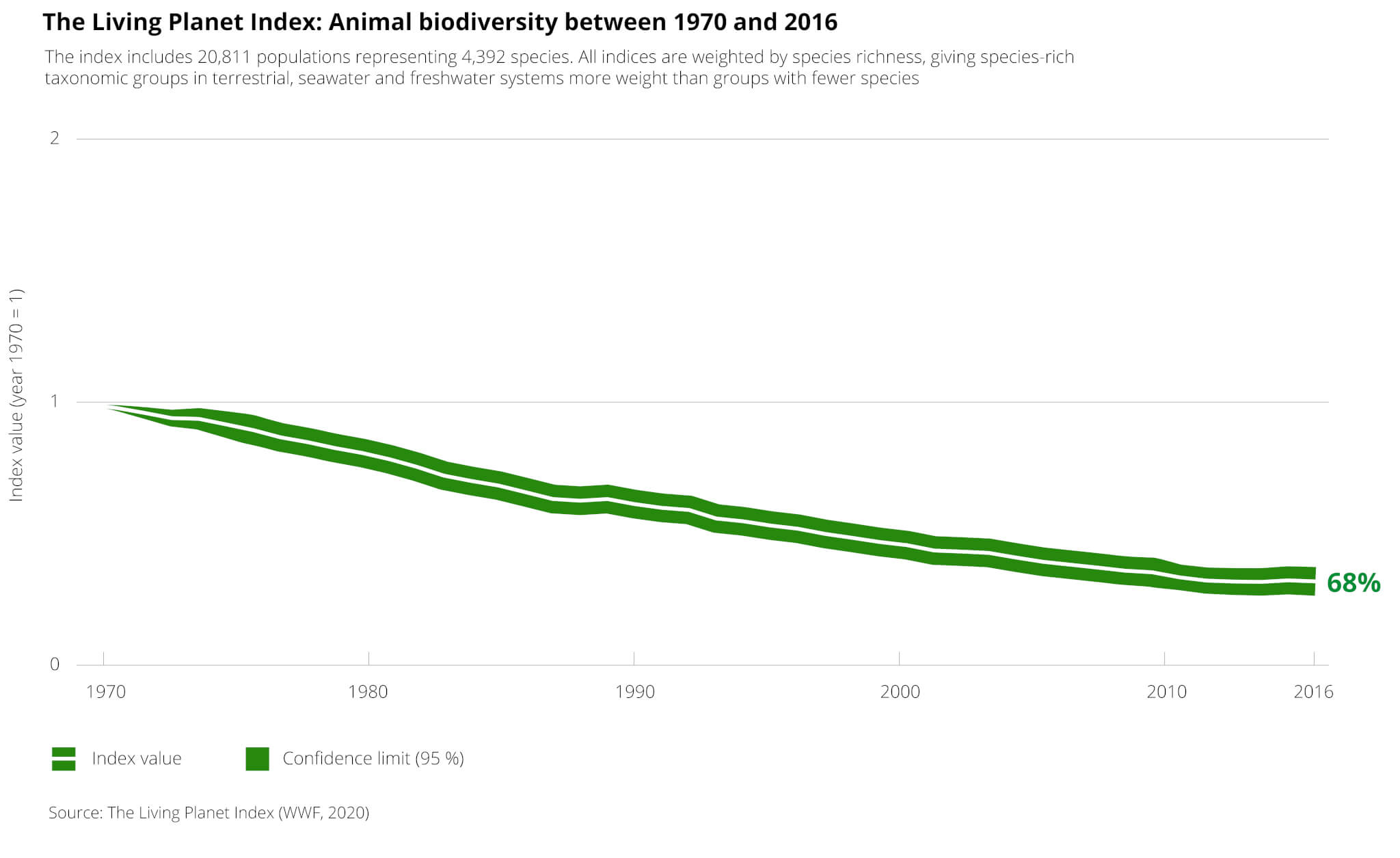 According to the global Living Planet Index 2020, the population sizes of mammals, birds, amphibians, reptiles and fish have experienced an unbelievable average decline of 68% between 1970 and 2016. The study identifies land and sea exploitation, including loss and degradation of natural habitats, as the biggest threat. This trend is the same on all continents, across all classes of animal and plant species. Moreover, the data have also shown a stable decline in the distribution of species across habitats and a decrease in available habitats together with decreasing intact biodiversity, proving the global effects of intense human activity in the past decades.