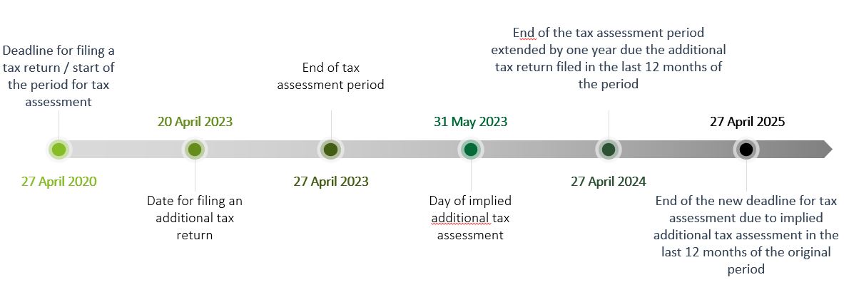 An example would be the submission of an additional VAT return for the tax period of March 2020, whose tax assessment period started running on 27 April 2020 and would have expired on 27 April 2023. However, if the taxpayer submits an additional tax return within the last 12 months of the period, the preclusive period is extended to 27 April 2024.