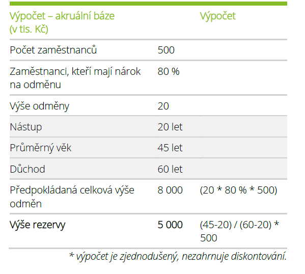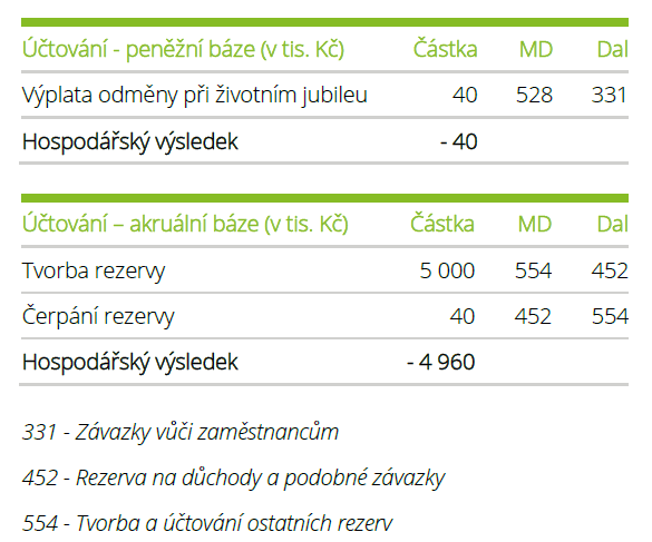 The method of calculation and valuation of the reserve is not clear at first sight from the Accounting Act or from the Regulation, and many entities therefore forget about them and do not account for the reserve for bonuses on major birthdays, work anniversaries, retirement etc. Instead they account only for the actually incurred expenses during the reporting period with respect to the person to whom the benefits have been paid out. These reporting entities use cash accounting (i.e. at the time when the cash outflow occurs) and not accrual accounting (at the time when the payable originates).