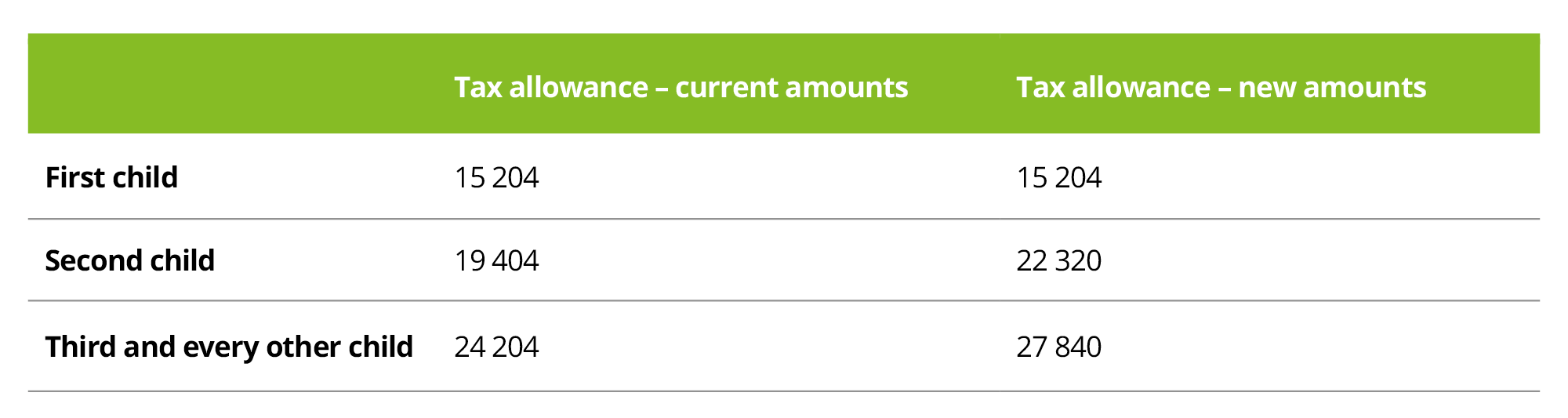 The table below presents an overview of the current and newly approved tax allowance amounts: