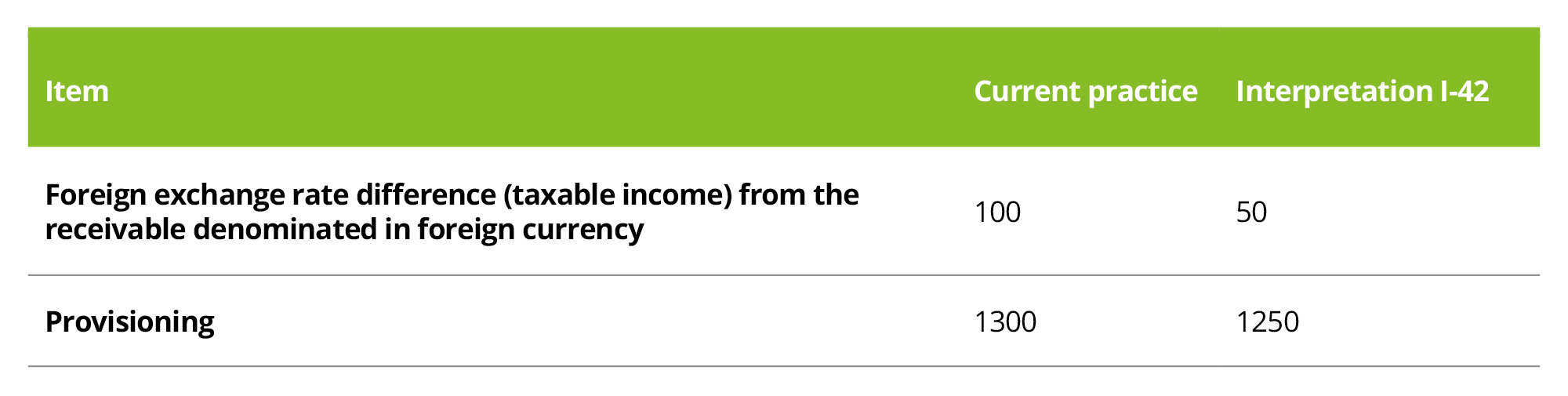 If we are to summarise the proposed alternative approach by Interpretation I-42 in one sentence, then “an exchange rate difference in a foreign currency receivable arises only from the value of the receivable decreased by its provision, i.e. the net value of the receivable which is a representation of the expected cash flow“. The interpretation itself admits that this approach differs from the so far established approach to accounting for foreign exchange rate differences in these situations, with the accounting presentation being a key starting point in foreign exchange rate differences and provisioning for the tax base.