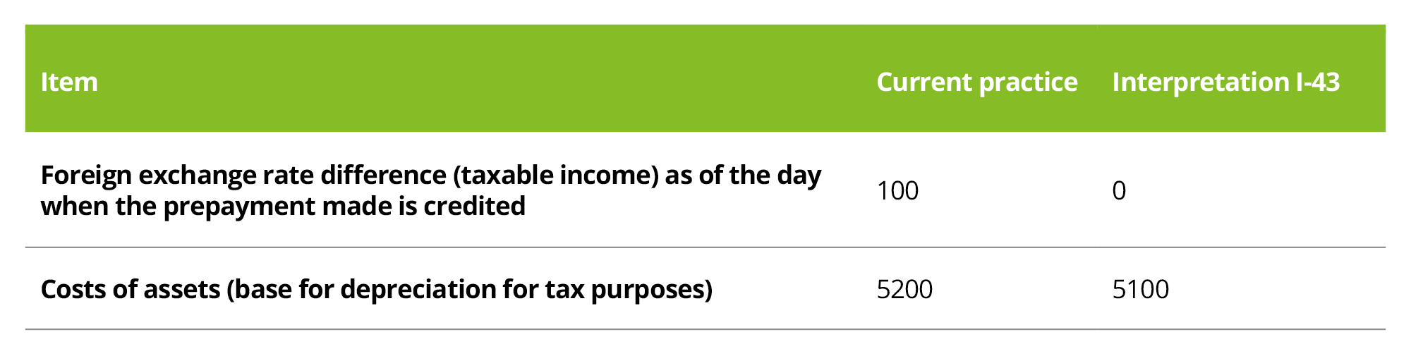 a “shift in time” from the tax base perspective as the tax base from this transaction will be ultimately decreased by the same amount, i.e. CZK 5,100. However, the tax authority might try to additionally assess the missing income in the form of a foreign exchange rate gain in the year of the asset acquisition, if the taxpayer follows Interpretation I-43.