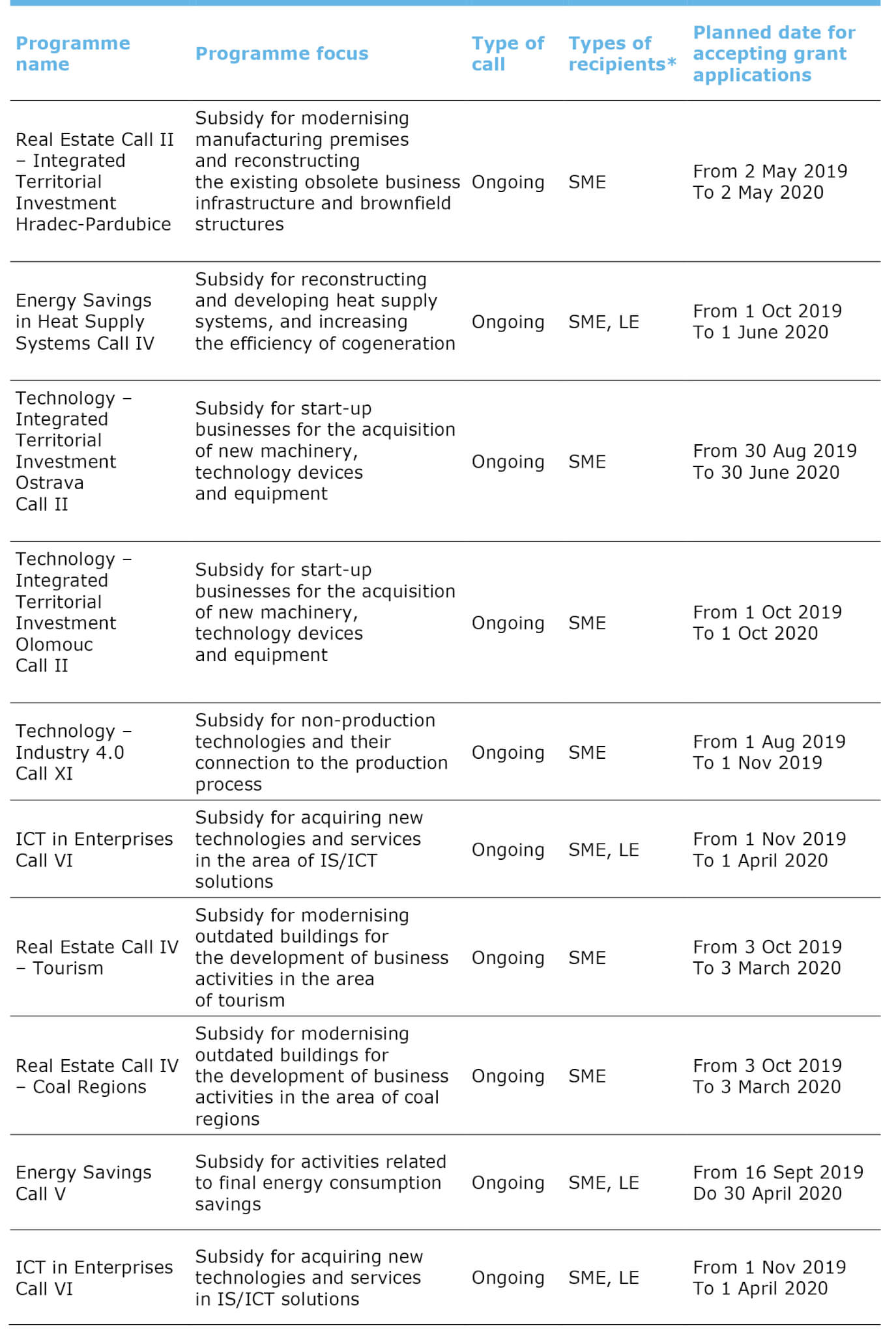 The timetable of OP PIK calls for 2019 was updated in early May. The table below presents the latest schedule of the already announced calls under the Operational Programme Enterprise and Innovations for Competitiveness (“OP PIK”), including the deadlines for submitting grant applications in individual programmes.